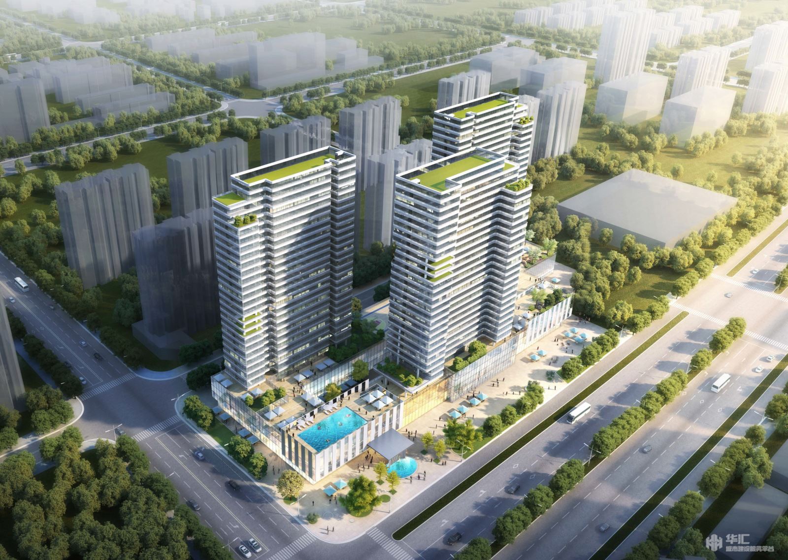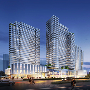 项目裙房集精品零售、酒店休闲、餐饮娱乐为一体,注重建筑形体与空间的整体环境效果,倡导采用开放式街区理念,增加交往公共空间的设置,通过设置外连廊、底层架空等方式提供户外活动的场地与空间。裙房上部设三栋酒店式公寓,形成围合式布局,采用现代风格立面通透、明亮,同时发展垂直绿化屋面绿化等多种形式的立体绿化,创造宜居的办公和居住环境。