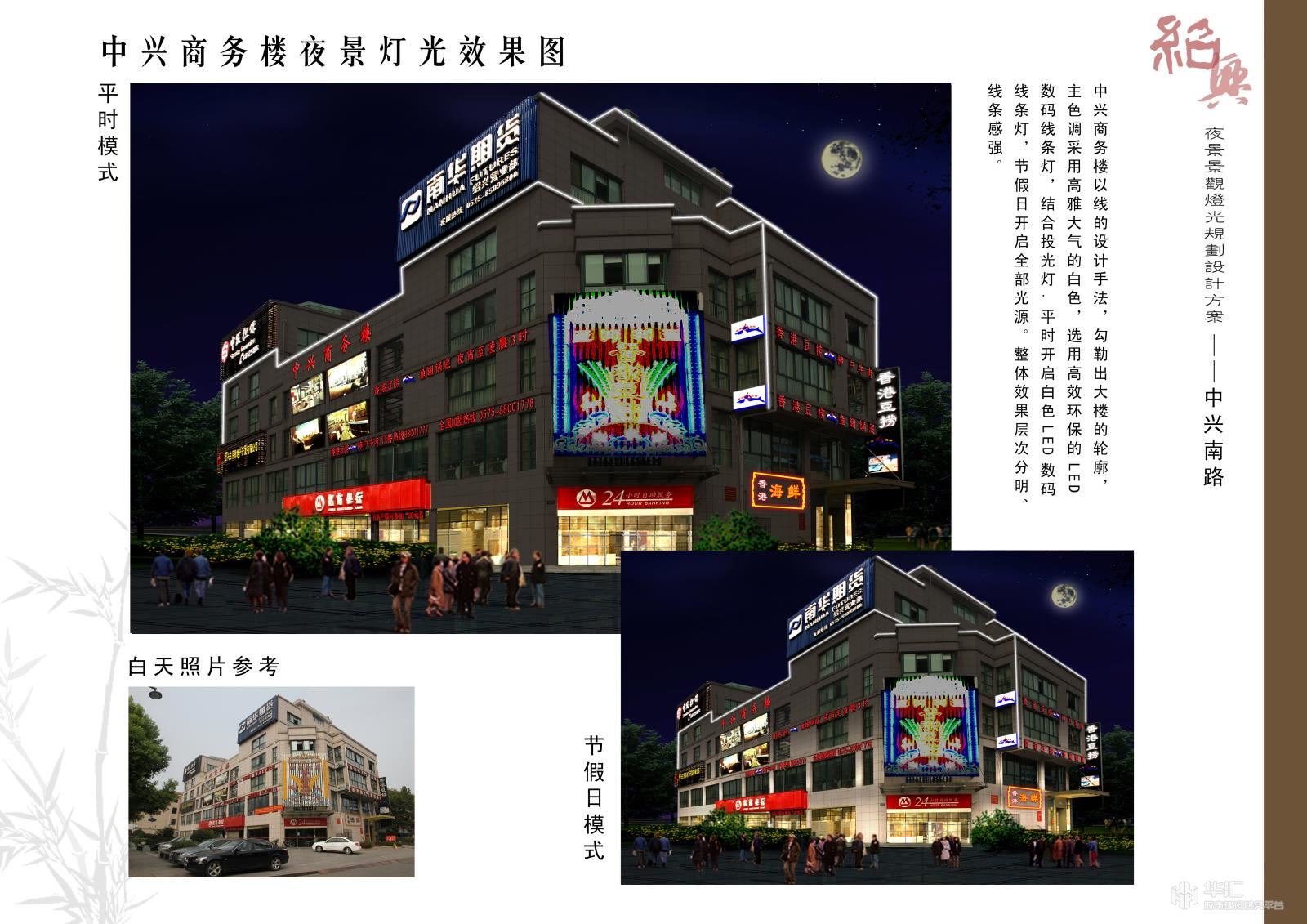 本工程为市区解放路,中兴路,人民路,胜利路的40座楼宇亮化提升项目设计,设计采用简洁,优雅为原则,统一了这四个街区的夜景灯光风格,改变了原有夜景杂乱无章的现状。再结合街区的风格以及建筑物的形状特点,把全部灯光分为平时和节日两种模式,通过不同时间段的控制满足平时和假日的效果需求,也节约了大量电能。