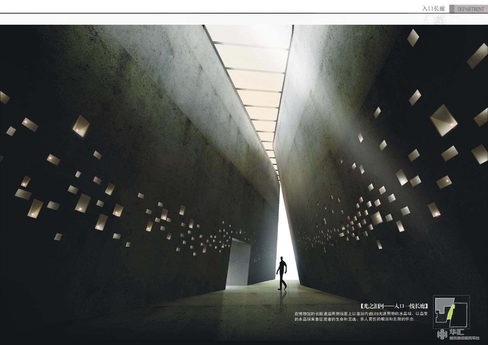 建筑的形态和空间是通过一块巨石的断裂, 错位,扭曲,倾斜,再现地震的破坏力,裂开的缝隙是博物馆的入口,两边曲折粗糙的。墙壁向下倾斜,头顶露出线天,意图让每一-位博物馆的参观者都能体会到地震后被压迫在缝隙下人们的感受,黑暗、压抑、害.....最后还有线希望。博物馆建筑外墙材料选自青川本地盛产的页岩。