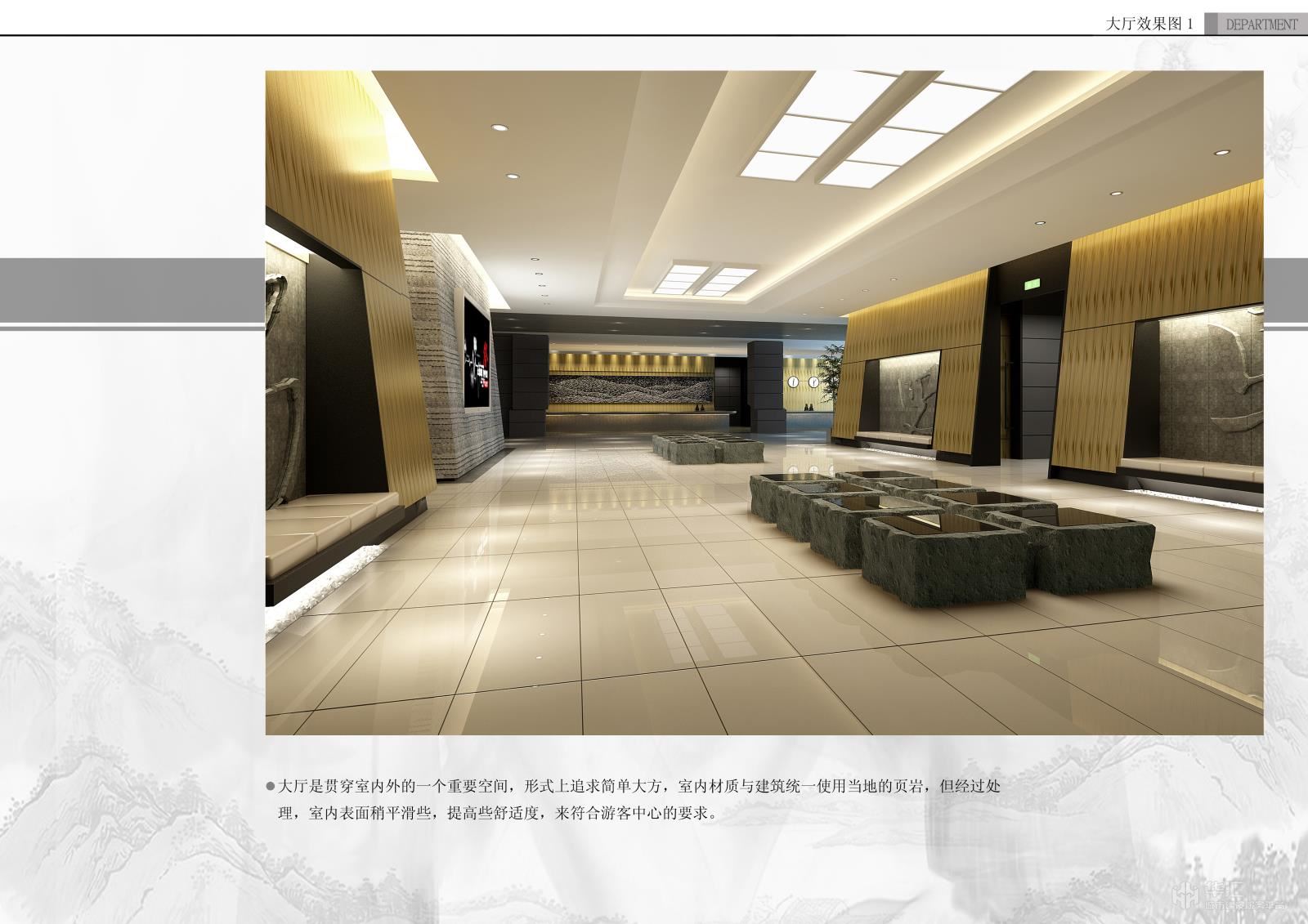 大厅是贯穿室内外的一个重要空间,形式上追求简单大方,室内材质与建筑统一使用当地的页岩,但经过处理,室内表面稍平滑些,提高些舒适度,来符合游客中心的要求。