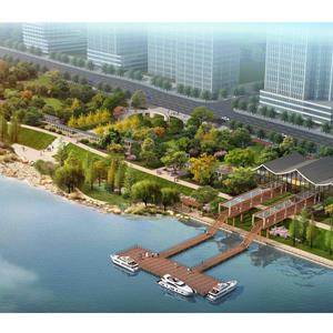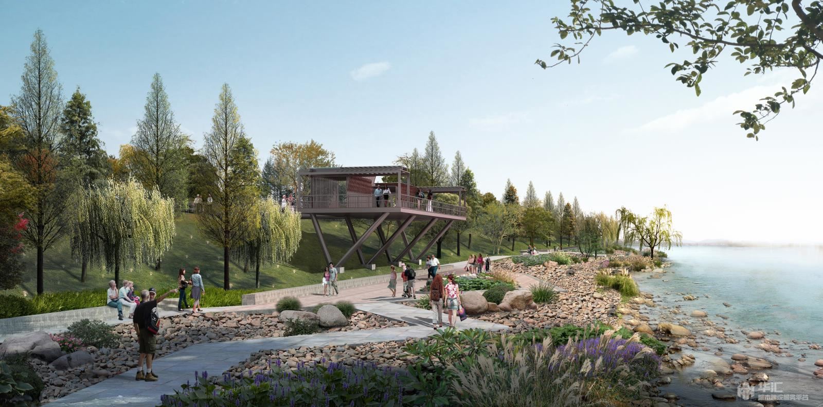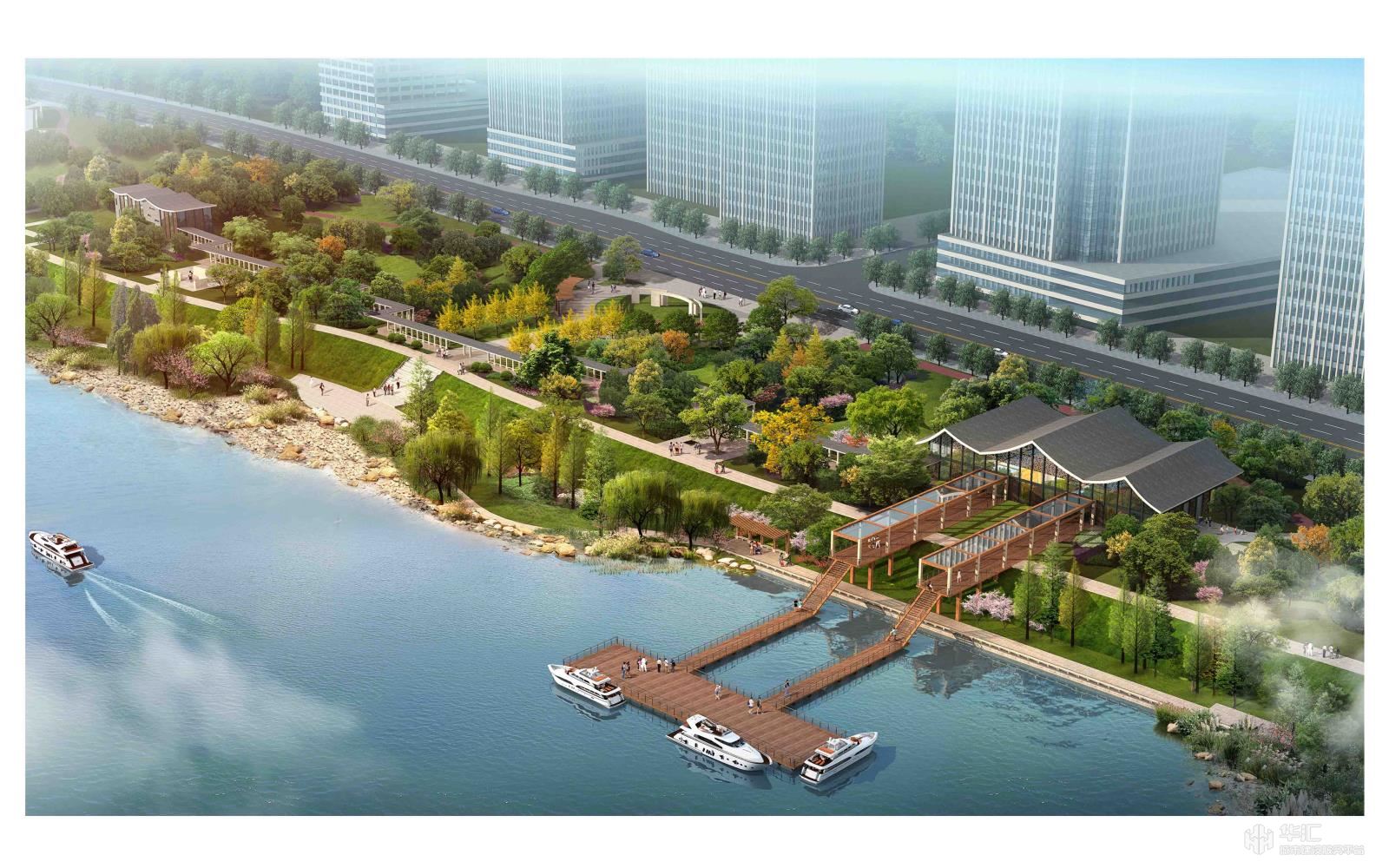场地内有一条横贯南北的防洪堤,天然高差使江岸景观与江滨西大道以北地块形成天然分割,堤顶至江边的土坡和驳岸自成体系。设计提取《富春山居图》中的“水”元素,以观赏辽阔江景为出发点,设置不同层级滨水栈道、浮动式游船码头、架空式观光栈道,并结合现状情况配置水生植物,保留并改造卵石滩,在不同水位情况下,游人都能欣赏到丰富类型的滨水景观,展现丰富的“水居”景观风貌。
