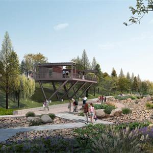 职教路至大坞溪段,景观场地逐步开阔,有较大进深腹地,现状植被茂盛,设计拟保留较好绿化资源,提取《富春山居图》里“林”的景观意向,配合周边体育休闲用地性质,以“闲适”为主题,林中穿插结合游步道、观鸟平台等,提供林间漫步、阳光运动、科普娱乐等功能,形成“林居”景观风貌。