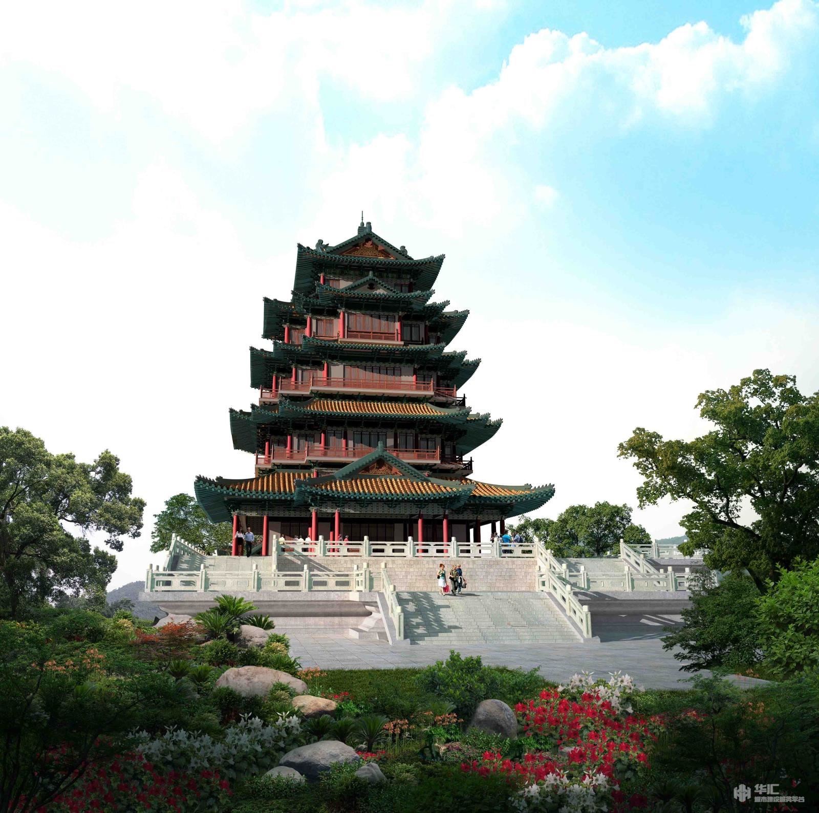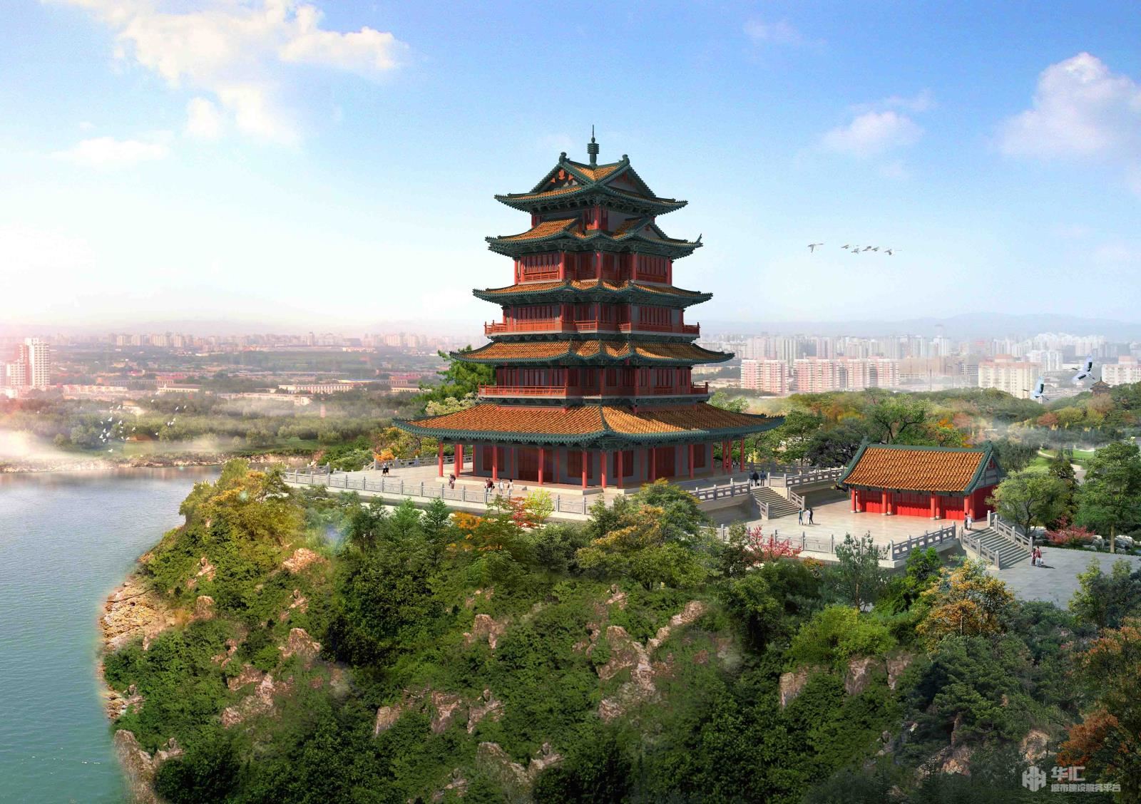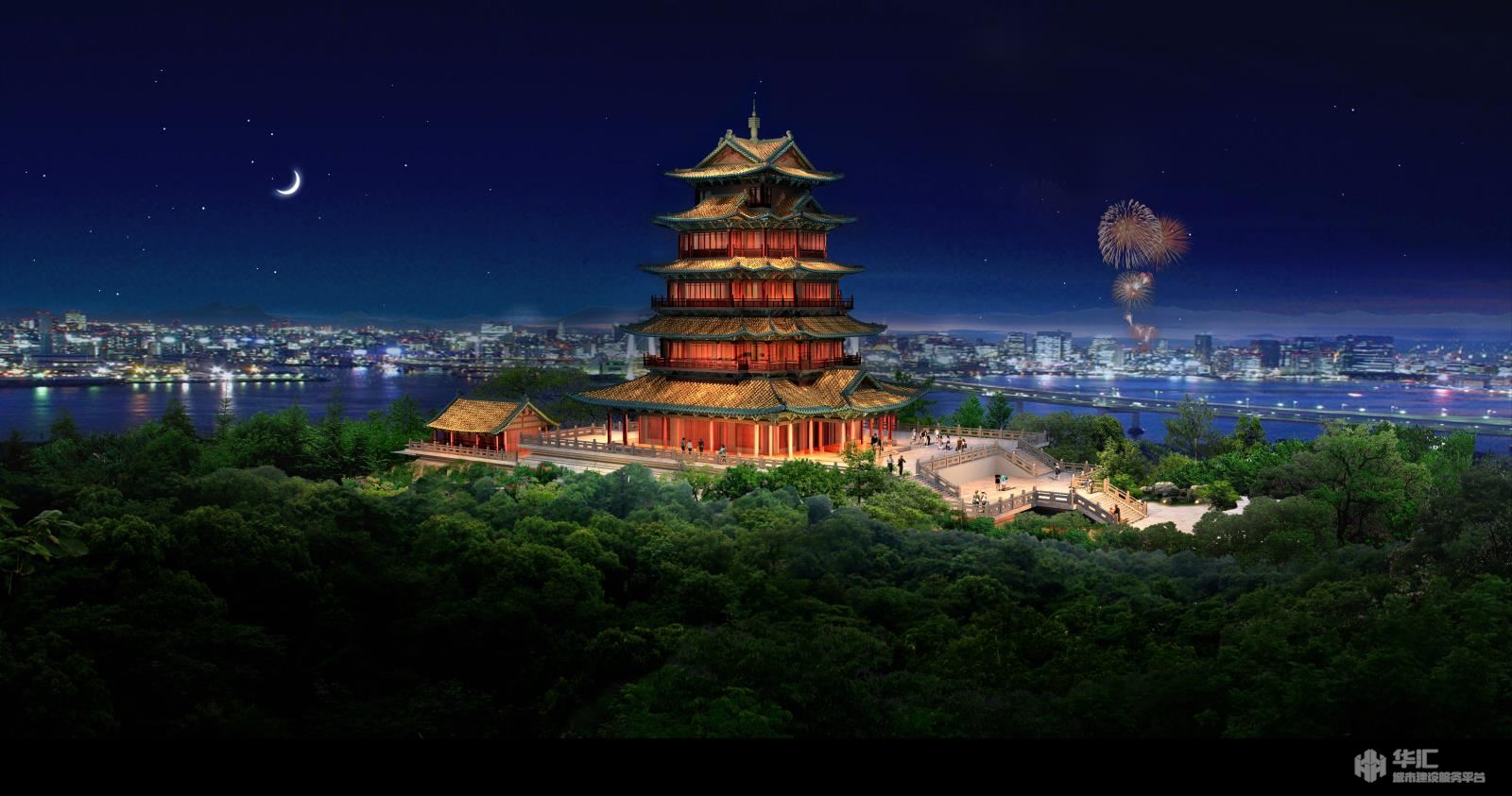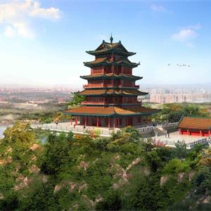 神岗山公园的西南面是禾河大桥进入城市的主界面,近年来生态破坏严重,该区域以生态修复为主题,植物选择上以本土植物为主,在禾河大桥下设计流线型片植植物。形成具有一定规模的线性空间. 以市树香樟为主的自然式成片打造。提升了区域内流域的生态品质,也鼓励了人与自然的进一步接触。设计在小庐山上拆除现有水塔,复建神岗亭。整体风格上与秀江楼风格保持一致。