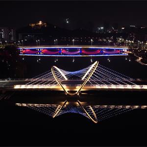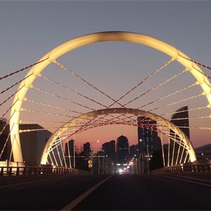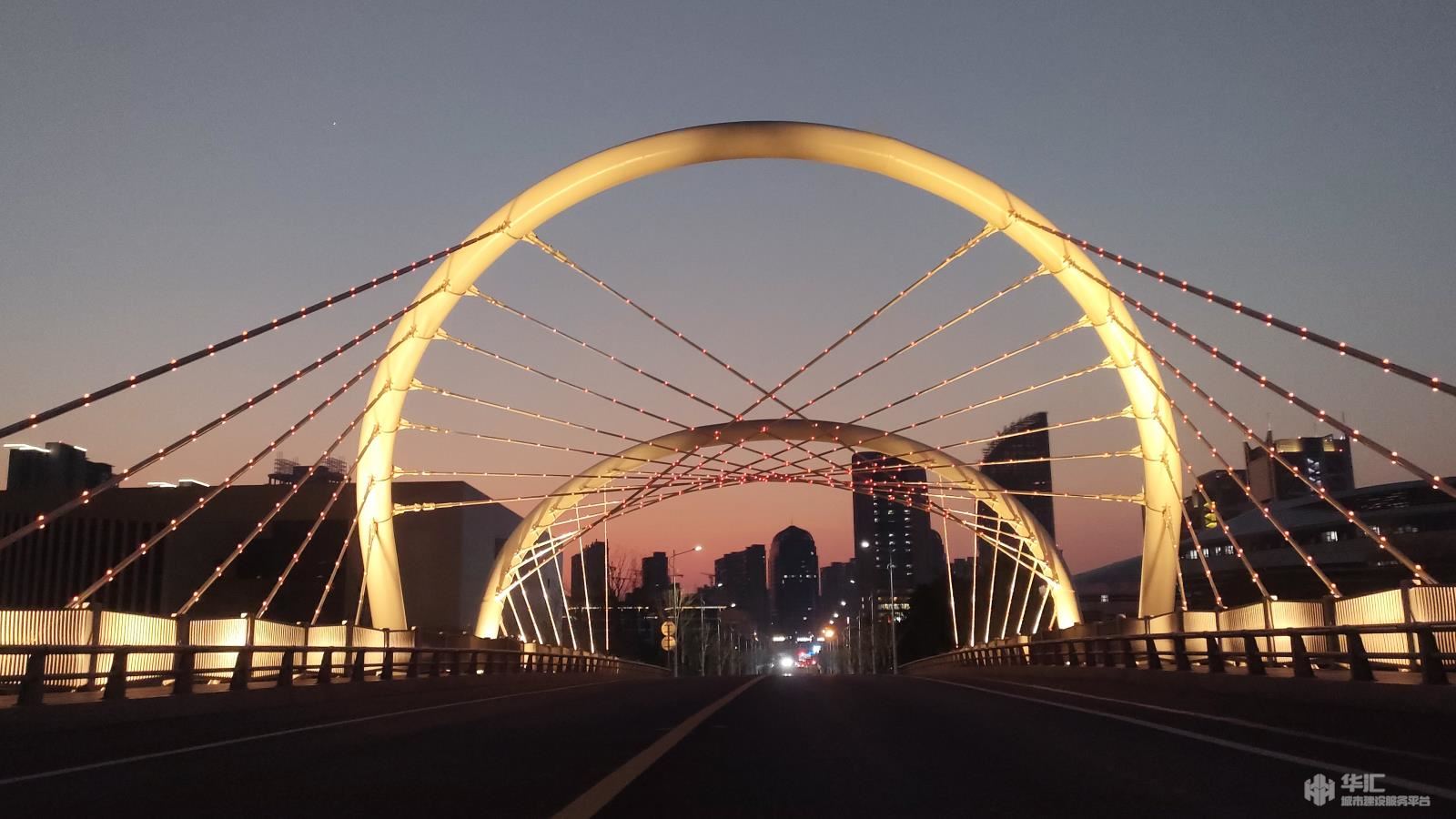 本工程设计桥梁位于锦帆路东段跨梅山江位置处。桥梁起终点桩号为0+828.14~0+957.86,桥梁全长为129.72m,跨径布置 (45+55+25)m,路幅宽度20m。桥梁上部采用V型斜塔空间拉索钢箱梁结构,V型索塔采用双圆拱结构。下部结构采用V型斜腿钢管混凝土柱墩,桥台采用壁式台,基础采用承台接群桩基础。桥梁梁底标高按内河七级航道控制。