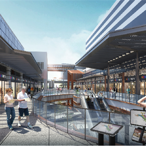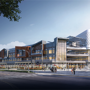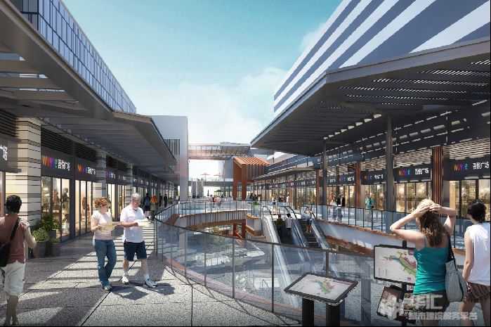交通价值:综合周边资源及上位规划分析可知,海潮东路为主要城市界面,海潮东路由西至东为主要人流方向,其与捍海路交叉口为主要的城市形象节点。因此,将购物中心展示面设置于基地北侧,沿购物中心南侧布置现代风情商业街。