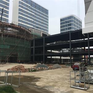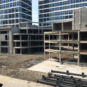 原项目分南、北独立两个区块,由6幢13~18层塔楼及其4~5层裙房组成的市场,改造前,项目主体结构已结顶,建筑墙体已砌筑完毕,设备管线基本安装到位。现需将裙房及地下区域进行改造,总改造面积约142000m2,其中地上81800m2,地下60200m2,改造后需满足商业综合体的建筑造型和各项功能要求。本项目重点改造的内容包括:业态调整,如增设大型超市卖场、真冰场、影院等;设备用房及管道洞口调整,如增设配电房、泵房、空调机房等;建筑动线调整,如增加室内步行街后原结构楼面大面积开洞;楼面行车路线调整,如增加室内外消防车通道,地下室货车通道和垃圾车运输通道等;室外增设下沉式广场;新增消防疏散楼梯及建筑功能配套的自动扶梯和电梯;增设步行街采光玻璃顶及中庭整体改造;局部结构抽柱或梁柱转换。