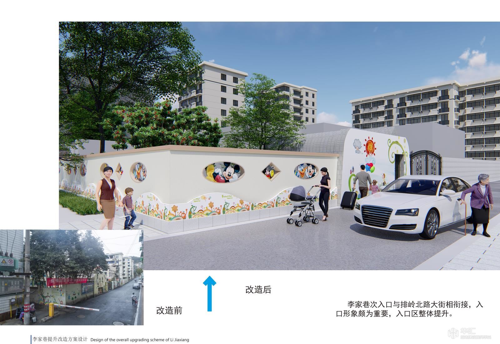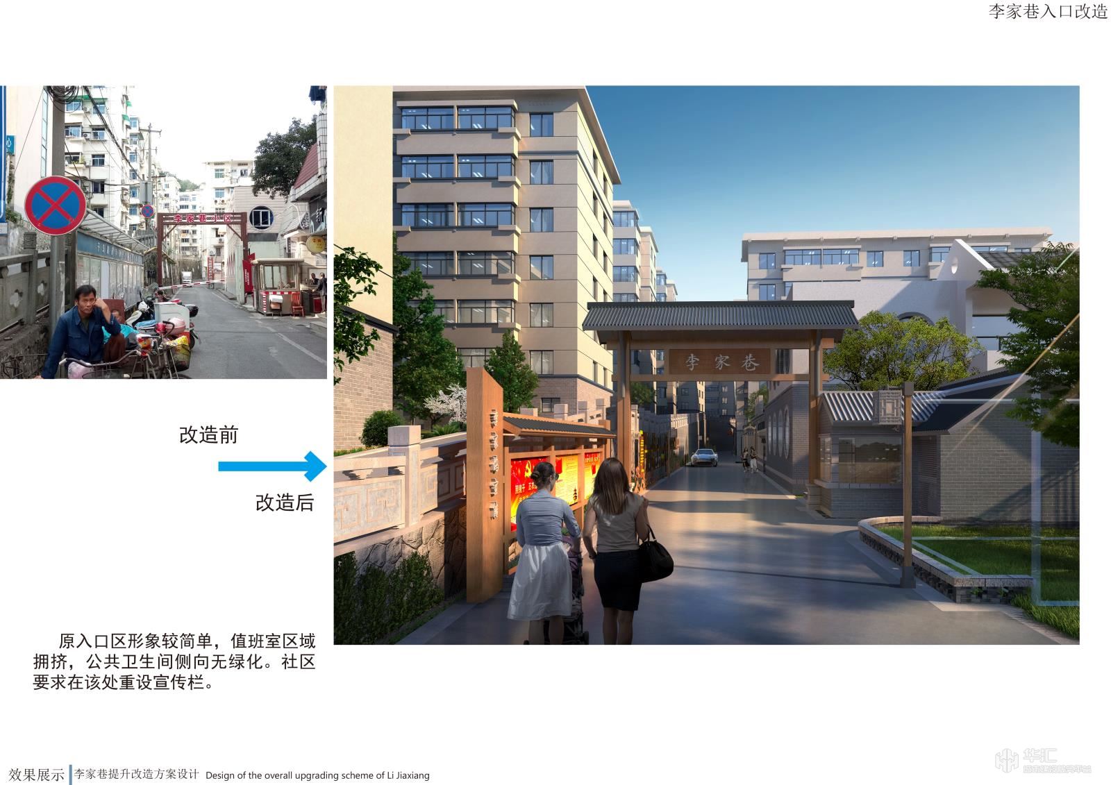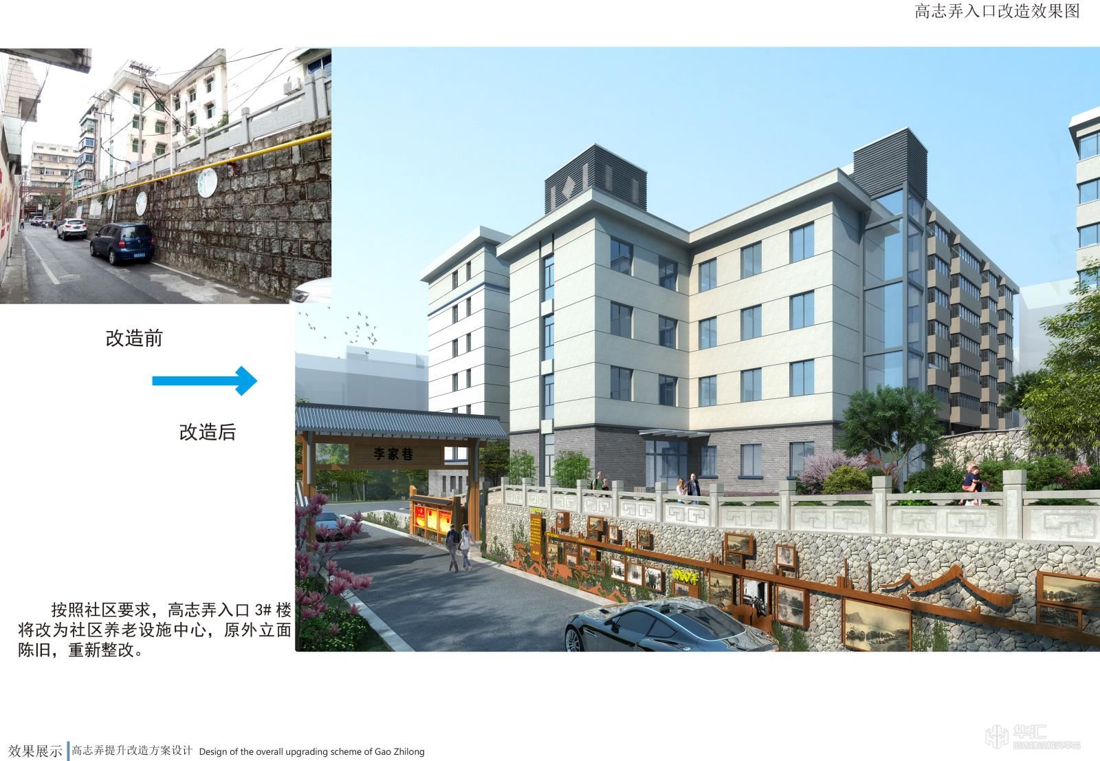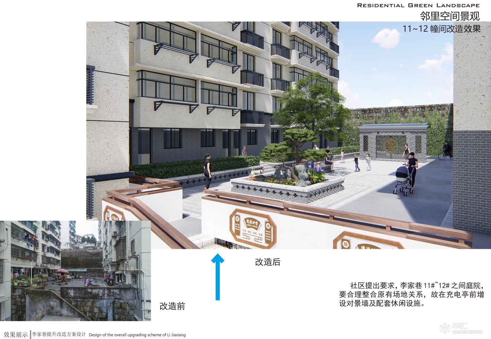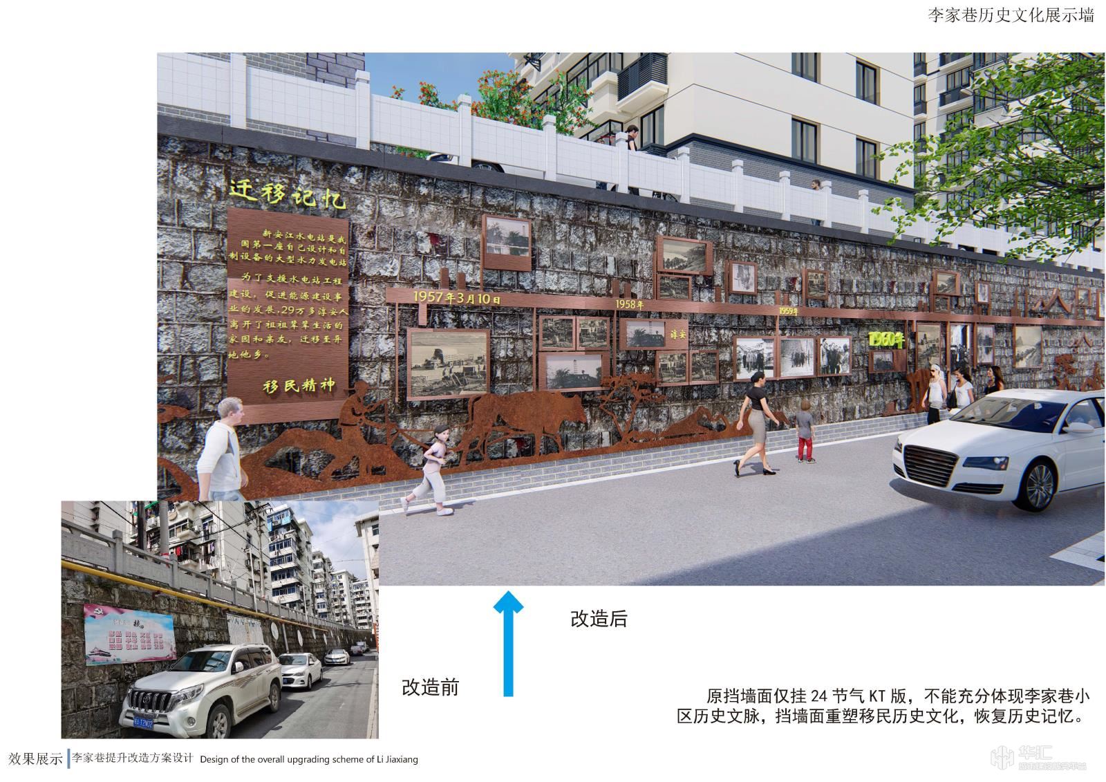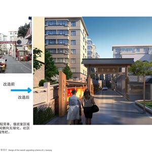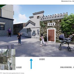 项目以新安江电站移民历史为元素,结合小区现状恢复历史古韵,小区节点景观与道路、停车位、户外活动场地相结合,提升小区品味