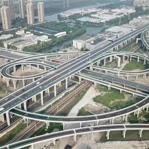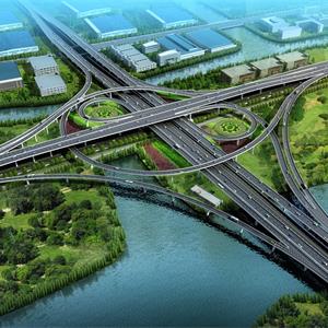 104国道与镜水路互交叉处考虑萧甬铁路、杭甬运河等复杂现场条件,该处采用环形匝道、直连式、半直连式匝道相结合的复合式枢纽型互通立交形式。立交规模大,功能齐全,桥型结构采用了现浇箱梁、钢混结合梁等形式。