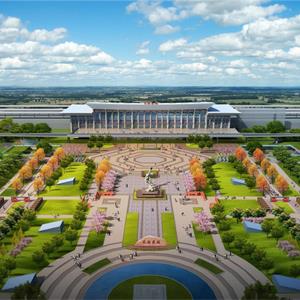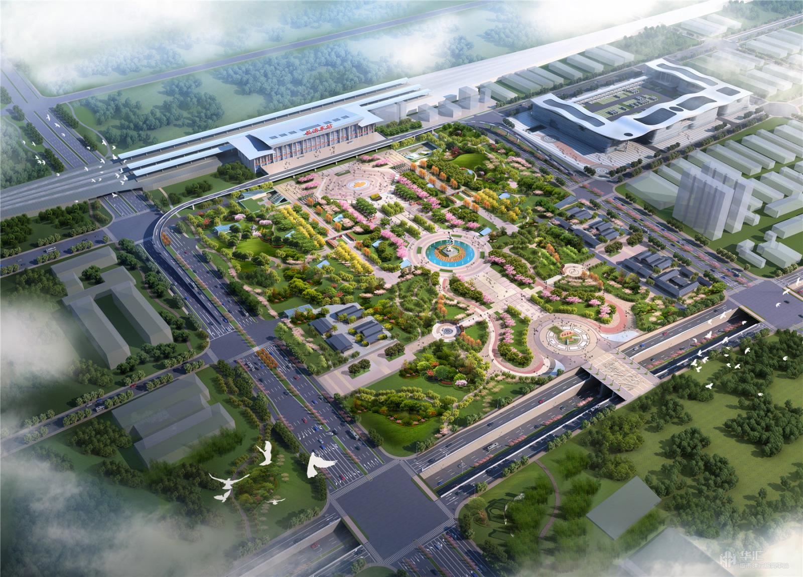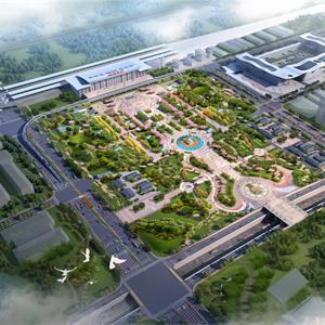 ①站前广场占地面积227.12亩,主要建设内容包括站前疏散广场、绿化景观及相关配套设施。