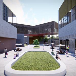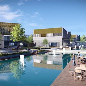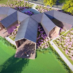西侧带状湿地片:由贯穿产业区的长滩寺河水系及湿地组成。主要以生态保育、水体净化为主要供能。两岸为湿地自然岸线。自西向东设置五个放大节点,设置与湿地和周边企业需求相关的小型建筑物,湿地茶馆、百药坊、观渠台(利用原有极具特点的灌溉水渠)、竹林企业家会所、水边农家等。