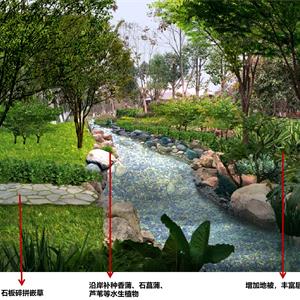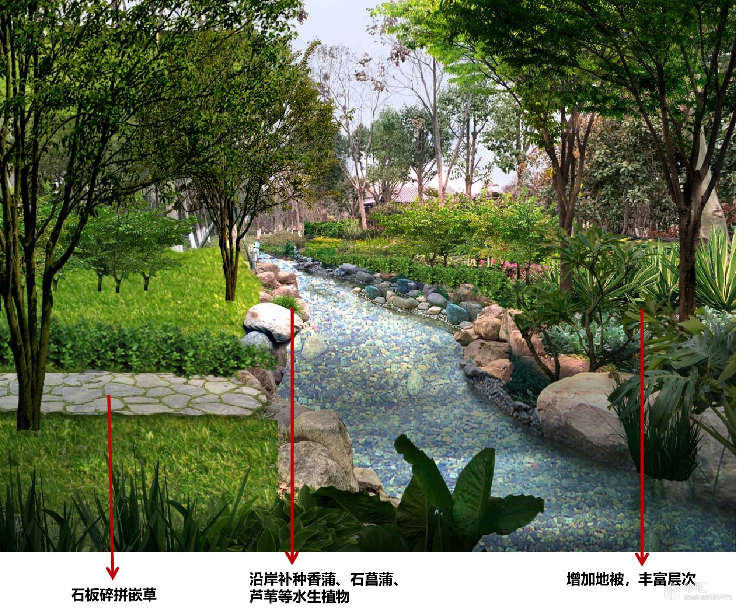3)瑞丰商学院西南侧:竖向不协调,导致局部水流不畅、苔藓杂草丛生,两岸植被缺失,色彩层次不够丰富。