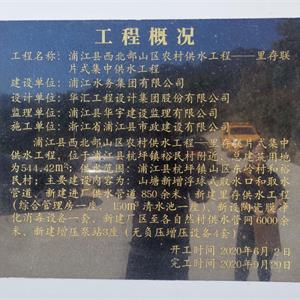浦江县西北部山区农村供水工程(管道部分)是由浦江水务集团有限公司作为投资建设主体。设计DN300-DN500输水主管总长约39公里主管,DN200以下支管约120公里供应5个乡镇,以及一个区域供水的小型一体化净水厂-里存水厂。项目位于浦江县西北部山区。主要是为浦江县西北部山区供水,其中供水范围包括:杭坪镇、檀溪镇、虞宅乡、大畈乡、中余乡(两镇三乡)。