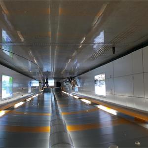 1、为确保道路管道埋深、行政中心入口处人工河标高等需求,贯穿三中心的地下通道设计中采用泡沫砼回填、硬质防水板使用、长距离植筋等技术措施较好的解决了平面标高、纵向坡差较大的难题。同时在人行通道入口处采用国际领先的倾斜式无障碍升降平台解决残疾人上下梯道问题,在绍兴属于首次采用。