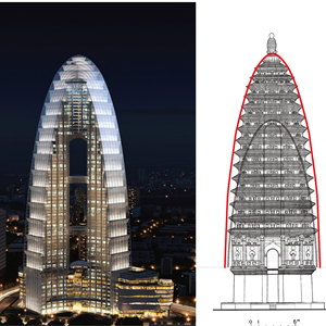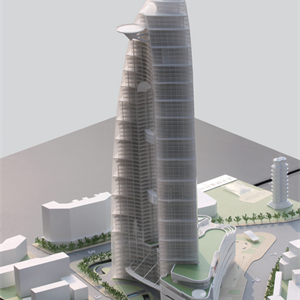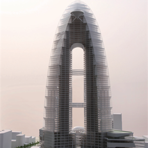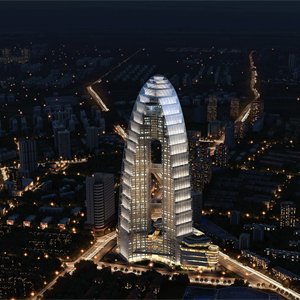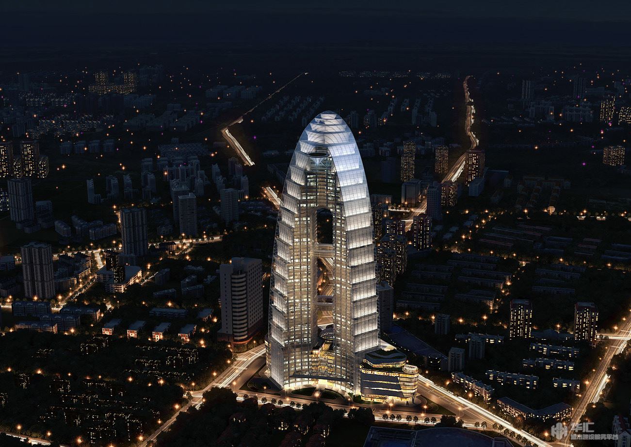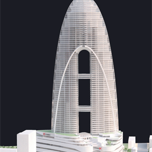项目详情:方案设计的概念为“华夏之门——郑州的门户”,传承着历史的光辉和未来的辉煌,寓意着华夏文明的复兴及传承。商业结合中原地区悠久的历史文化布置商业主题中心。树木、瀑布、连廊形成一条贯穿东西的商业流线和视线通廊。塔楼部分设计为独立的两栋塔楼,总高度 339 米,层数 72 层,到 53 层通过钢结构相连接,跨度为 26 米。于拱门两侧放置景观高速电梯直达观光层和空中花园。结合塔楼的层层收进和功能的组织,核心筒的布置做到经济、合理、效率。
