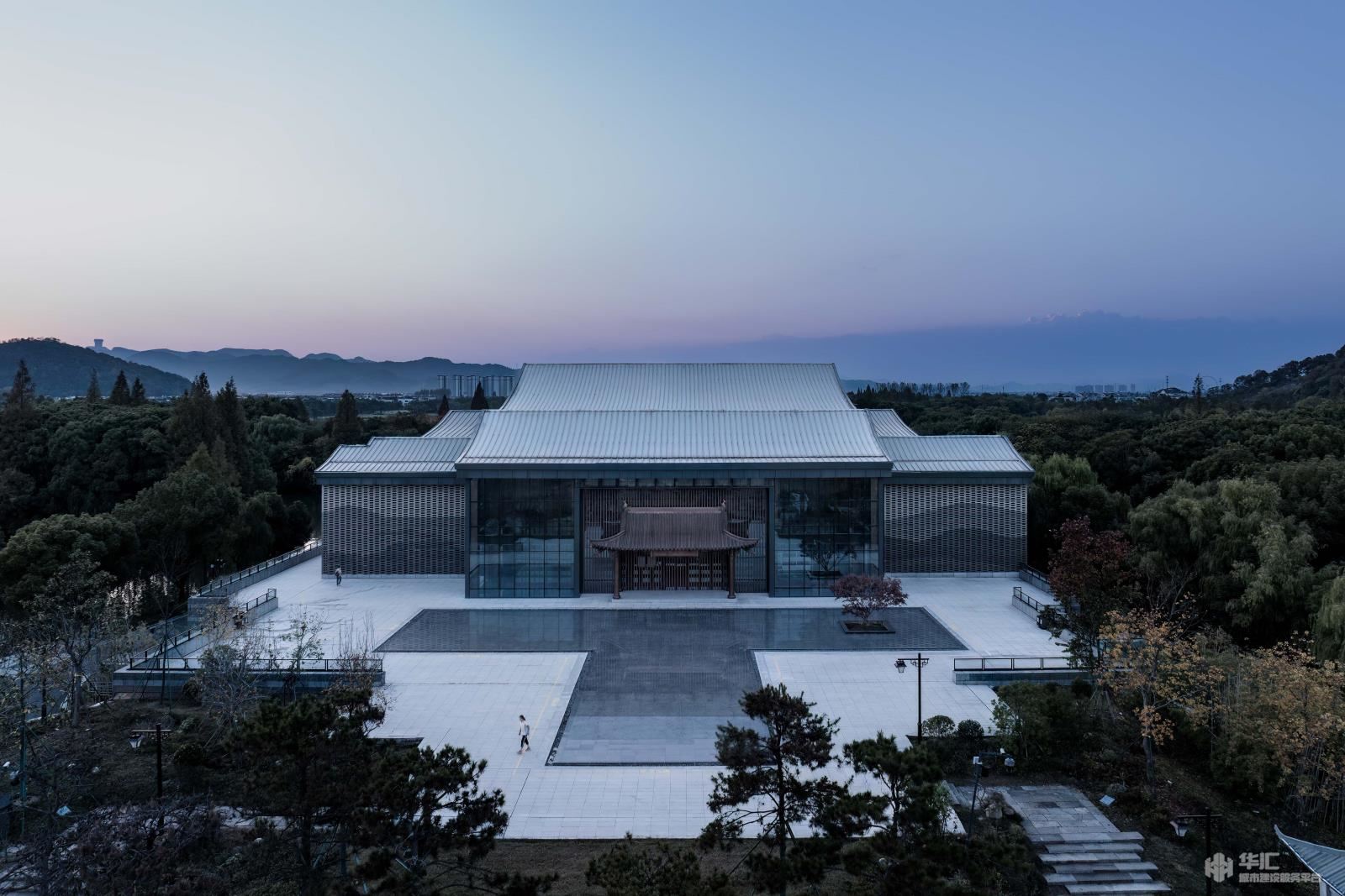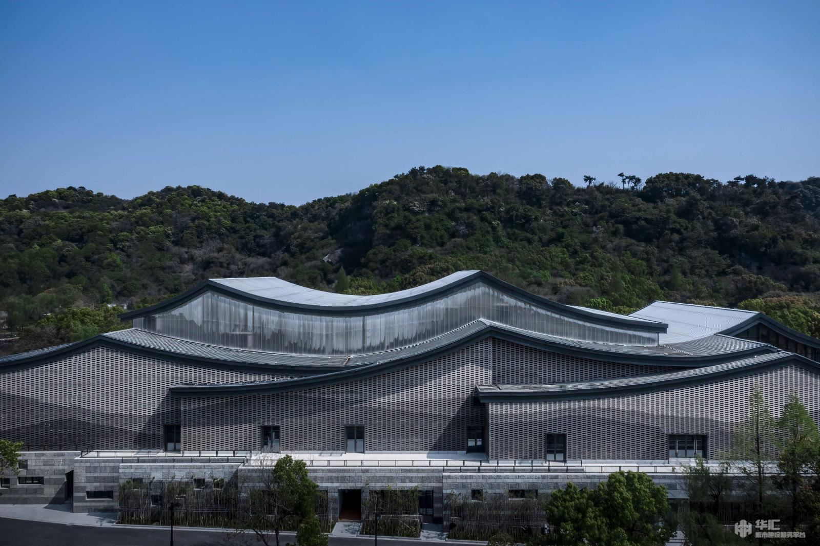 规划设计的初始意图在于合理的、清晰的安排整个空间的功能需求,尽可能在比较小的用地空间内满足演艺剧场的设计功能,并创造出宽广、实用的场外景观空间。建筑力求物明快简洁,将传统元素与现代元素进行配搭,从传统的坡屋顶、青砖白墙到到高低起伏的流线型屋面、石材、陶砖的建筑外墙主元素,从在建筑外观撑着小船去看社戏到穿过戏台走进大剧场内,“坐在巨人的怀抱里,观看人间的悲喜爱恨”。