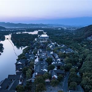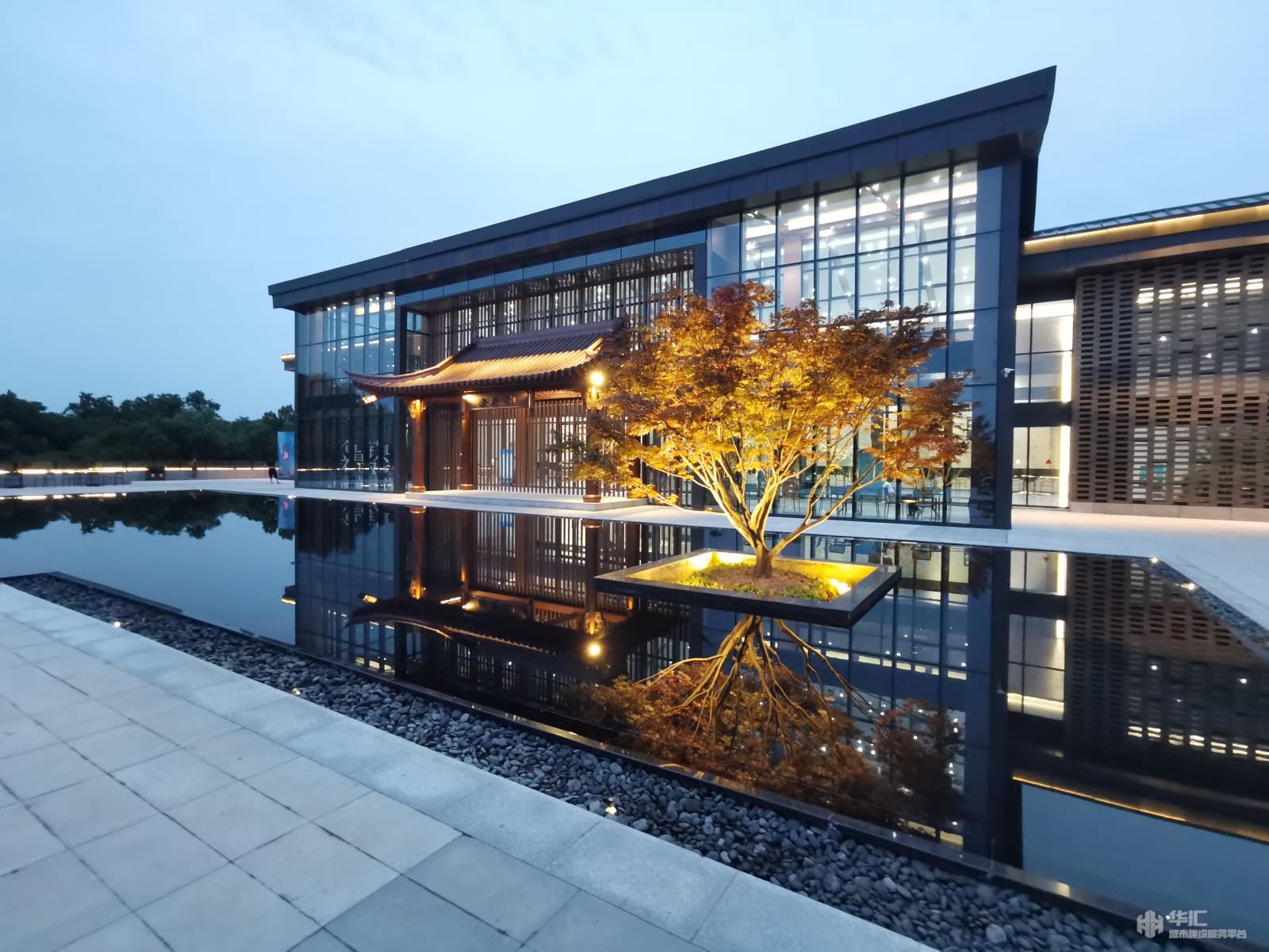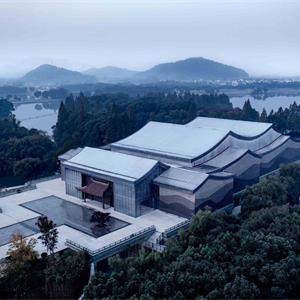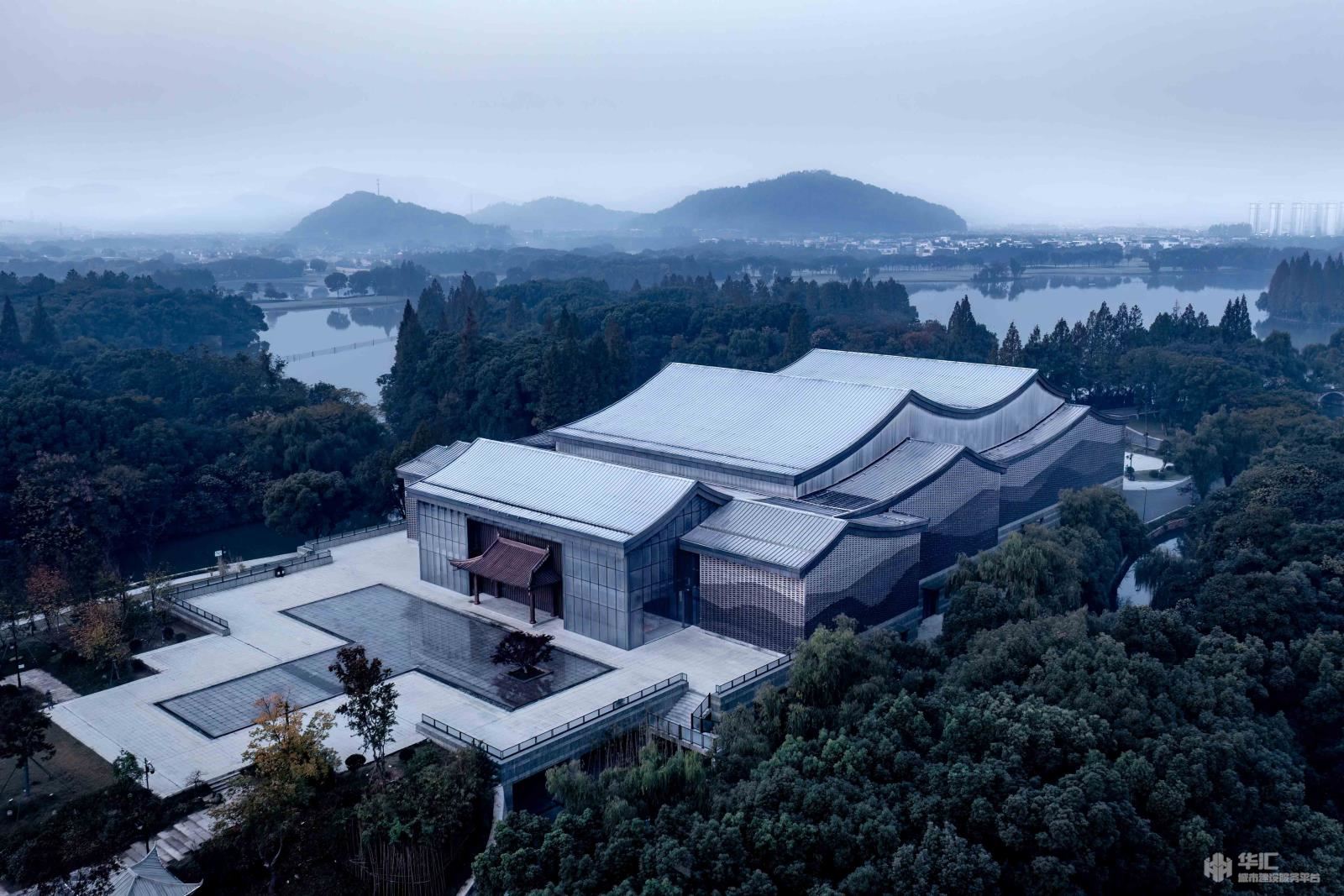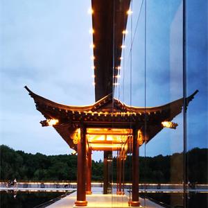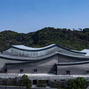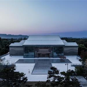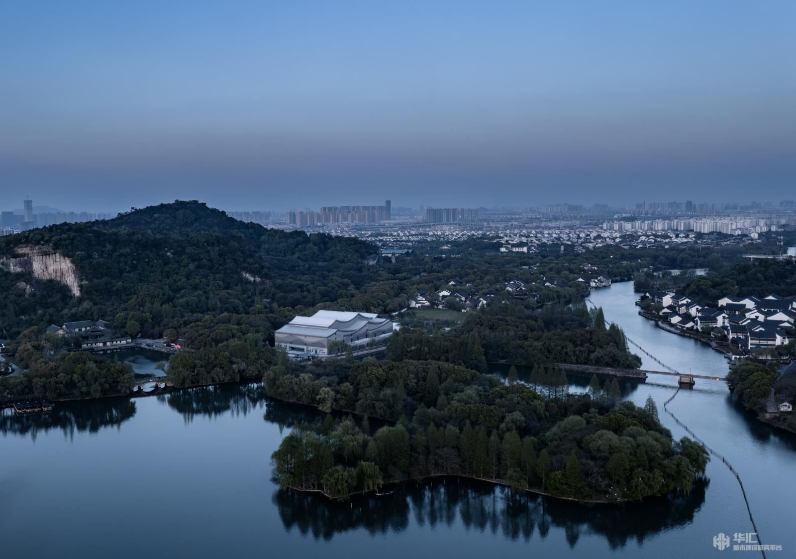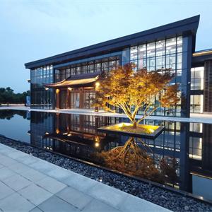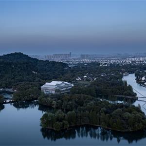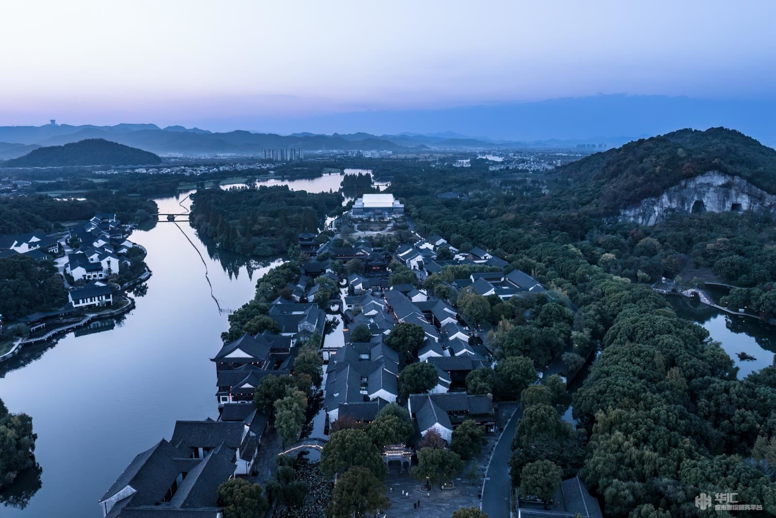 《鲁镇·社戏》演艺中心是大型影画剧定制剧场,项目位于国家级4A级绍兴柯岩风景区,通过视觉延展、形体差异、交错转折、高差台地、化整为零处理,大大削弱了剧场建筑的体量感,从而缓和与鲁镇原有小尺度环境的冲突,并营造和呈现了“现代山水意向”,使建筑嵌入鉴湖,融于古镇。主入口传统戏台是建筑与剧情矛盾冲突的营造。