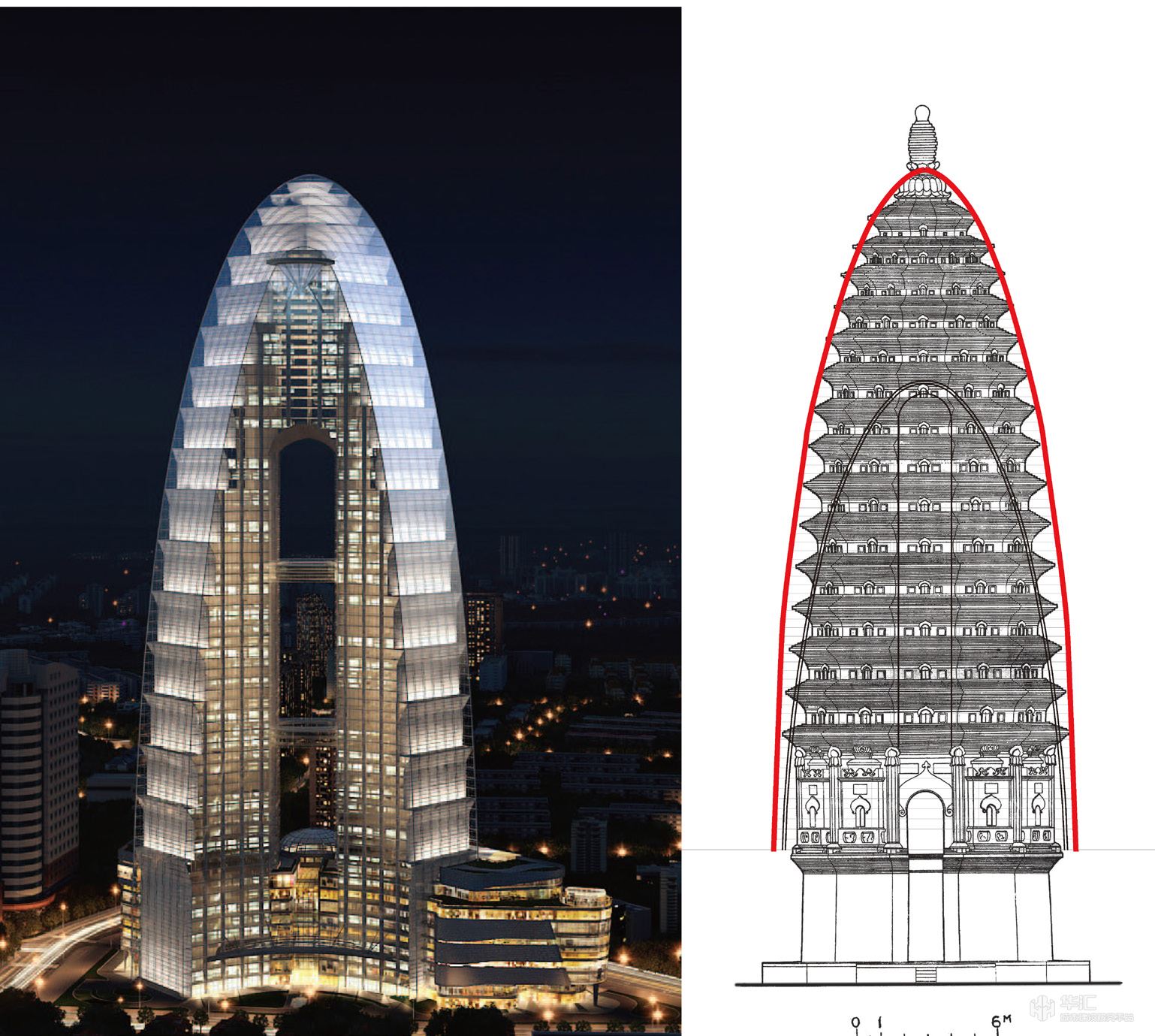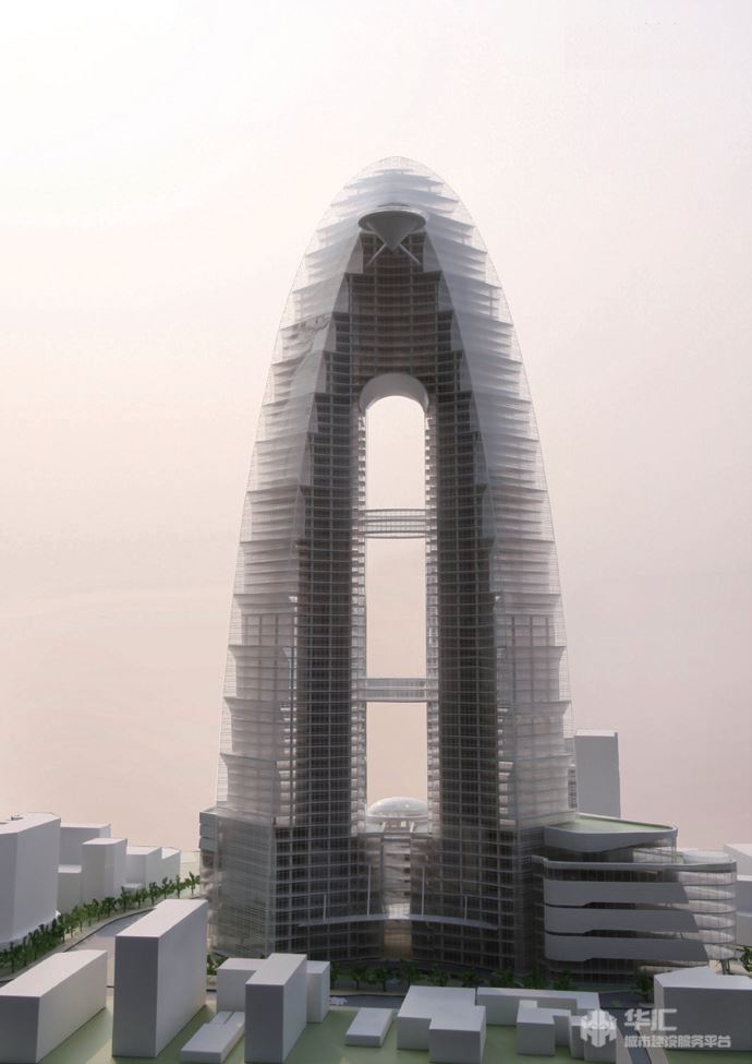 项目详情:方案设计的概念为“华夏之门——郑州的门户”,传承着历史的光辉和未来的辉煌,寓意着华夏文明的复兴及传承。商业结合中原地区悠久的历史文化布置商业主题中心。树木、瀑布、连廊形成一条贯穿东西的商业流线和视线通廊。塔楼部分设计为独立的两栋塔楼,总高度 339 米,层数 72 层,到 53 层通过钢结构相连接,跨度为 26 米。于拱门两侧放置景观高速电梯直达观光层和空中花园。结合塔楼的层层收进和功能的组织,核心筒的布置做到经济、合理、效率。